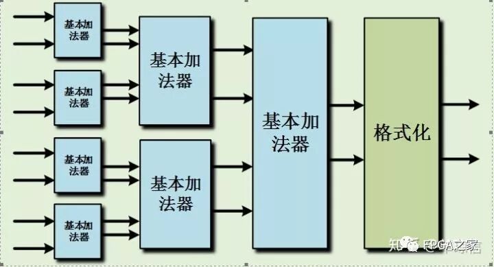 如果是一次而輸入加法則以這樣的結(jié)構(gòu)即可,但如果涉及多次加法,以流水形式完成,則在結(jié)構(gòu)上可以作更好的優(yōu)化。如下是四輸入和八輸入加法器的結(jié)構(gòu):