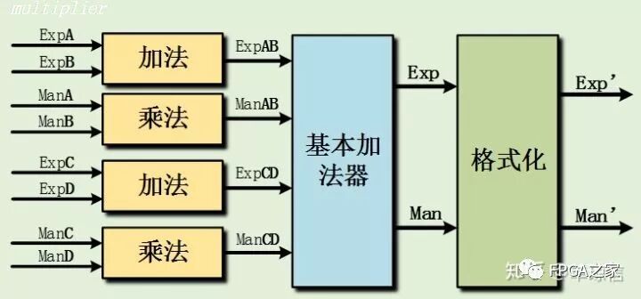 這樣即可省去乘法器中的格式化過程,將乘法的中間結(jié)果直接輸入給加法器,最后再進行格式化輸出。
