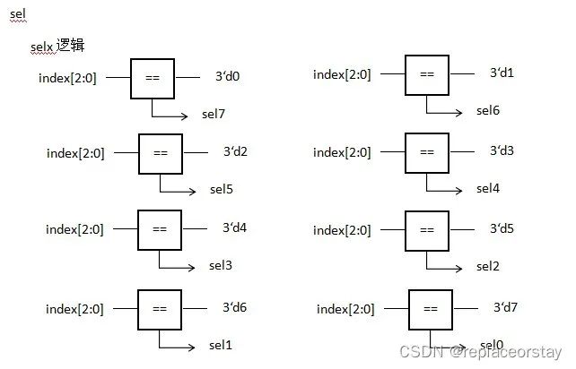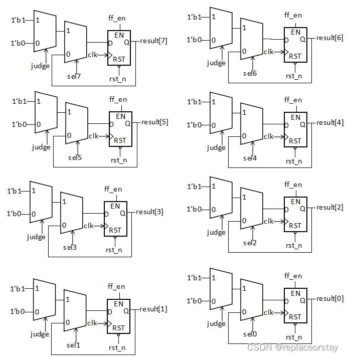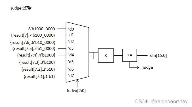 數(shù)據(jù)通路的關(guān)鍵是如何依次對result每一位判斷是否為1,這里引入中間信號index[2:0],用來記錄當(dāng)前應(yīng)該對哪一位數(shù)操作,這里的index可以為計數(shù)器輸出的低三位,再由index和乘法器比較器輸出中間信號judge,用來判斷該位是否為1,由index和常數(shù)進(jìn)行比較產(chǎn)生selx信號,作為MUX的選擇信號,最后用judge和selx驅(qū)動MUX輸出result的每一位。