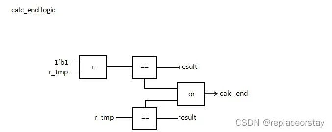 那么問題來了,怎么判斷計算結(jié)束了呢?我們通過上文二分法的例子發(fā)現(xiàn)計算完成時左操作數(shù)與右操作數(shù)不是相等就是差1,于是可以有以下的邏輯輸出calc_end,再輸入給狀態(tài)機(jī)使?fàn)顟B(tài)跳轉(zhuǎn)。