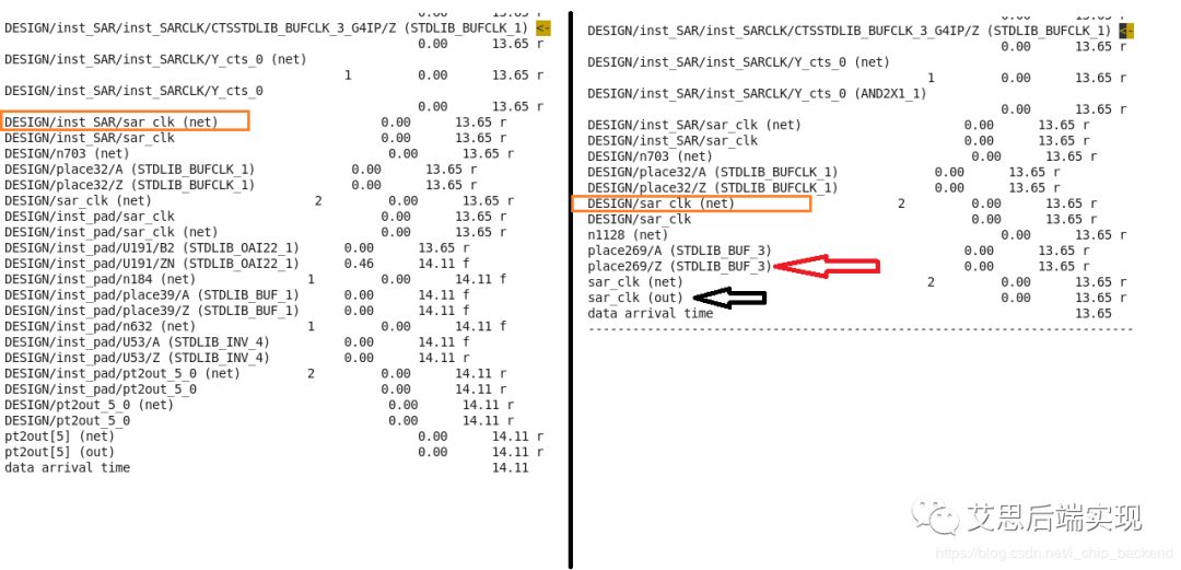 還是看一下ICC的timing report。對于FM而言,這里的sar_clk port 還是一個輸入激勵端,但是可以看到,這里的sar_clk的網(wǎng)表driver 是一個BUF/Z(place239/Z),按照lib的定義BUF是不能反向傳遞的,所以,F(xiàn)M-579的影響,到place239這里就截止了(注意到,place239/Z的負載只有一個),并不會影響其他的地方。