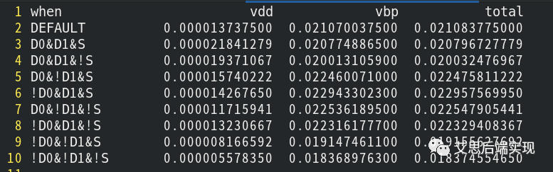 可以看到,這是一個三輸入的器件,那么總計會有8中輸入可能,lib的leakage的信息基于輸入可能性的全完備羅列。