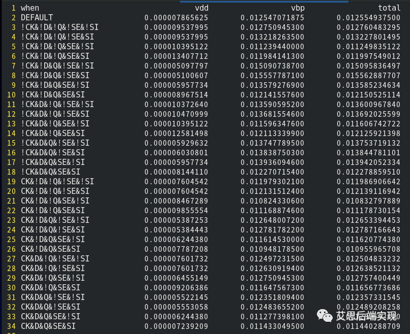 在上文也有提到一個更為精準(zhǔn)化的描述方式,SDPD (Status Dependency Path Dependency),這個對于功耗計算有實際的影響。那么為何在功耗的計算里邊會有這個SDPD呢?SDPD又是通過怎么樣的方式影響功耗計算呢?一起打開工藝庫的信息一探究竟吧!