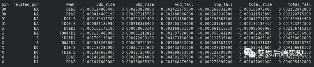 以MUX2 為例,一起看一下interenal power的描述:cell ("SEL_MUX2_4") { ...... pin (S) { capacitance : 0.002820029; direction : "input"; fall_capacitance : 0.002761232; max_transition : 4.308; related_ground_pin : VSS; related_power_pin : VDD; rise_capacitance : 0.002878826; internal_power () { # bias PG related internal_power description related_pg_pin : "VBP"; # condition when : "!D0&!D1"; fall_power ("pwr_tin_8") { index_1 ("0.009266, 0.0222816, 0.0535798, 0.1288418, 0.309822, 0.745016, 1.791516, 4.308"); values ("-5.63411e-05, -5.540512e-05, -6.377697e-05, -4.595821e-05, -6.756144e-05, -6.15605e-05, -6.171516e-05, -6.163207e-05"); } rise_power ("pwr_tin_8") { index_1 ("0.009266, 0.0222816, 0.0535798, 0.1288418, 0.309822, 0.745016, 1.791516, 4.308"); values ("8.111282e-05, 7.08698e-05, 5.968669e-05, 5.155256e-05, 5.807869e-05, 6.204414e-05, 6.182517e-05, 6.175735e-05"); } } internal_power () { # common PG related internal_power description related_pg_pin : "VDD"; # condition when : "!D0&!D1"; # the internal_power during pin S falling edge fall_power ("pwr_tin_8") { index_1 ("0.009266, 0.0222816, 0.0535798, 0.1288418, 0.309822, 0.745016, 1.791516, 4.308"); values ("0.002097898, 0.00210684, 0.001989685, 0.002036636, 0.001995899, 0.001987284, 0.001991492, 0.002053458"); } # the internal_power during pin S rising edge rise_power ("pwr_tin_8") { index_1 ("0.009266, 0.0222816, 0.0535798, 0.1288418, 0.309822, 0.745016, 1.791516, 4.308"); values ("-0.0001334809, -6.114718e-05, -0.000153519, -0.0001819992, -0.0002029397, -0.0002175415, -0.0002181976, } } } ...... pin (X) { direction : "output"; function : "((D0&!S)|(D1&S)|(D0&D1))"; max_capacitance : 0.8309614; max_transition : 4.308; min_capacitance : 6.155e-05; related_ground_pin : VSS; related_power_pin : VDD; power_down_function : "!VDD+!VBP+VSS+VBN"; internal_power () { related_pg_pin : "VBP"; # Path Dependency related_pin : "D0"; # Status Dependency when : "!D1&!S"; # X: falling edge power due to related D0 change. positive unate fall_power ("pwr_tin_oload_8x7") { index_1 ("0.009266, 0.0222816, 0.0535798, 0.1288418, 0.309822, 0.745016, 1.791516, 4.308"); index_2 ("6.155e-05, 0.000300464, 0.00146675, 0.00716013, 0.0349531, 0.170628, 0.832941"); values ("-0.0003287909, -0.0003265358, -0.0003263012, -0.0003258171, -0.0003259071, -0.0003233576, -0.0003219219", \ ...... "-0.0003294999, -0.0003285813, -0.0003292956, -0.0003293134, -0.0003286557, -0.0003291086, -0.0003283838"); } # X: rising edge power due to related D0 change. positive unate rise_power ("pwr_tin_oload_8x7") { index_1 ("0.009266, 0.0222816, 0.0535798, 0.1288418, 0.309822, 0.745016, 1.791516, 4.308"); index_2 ("6.155e-05, 0.000300464, 0.00146675, 0.00716013, 0.0349531, 0.170628, 0.832941"); values ("0.000327204, 0.000329085, 0.0003304601, 0.0003274369, 0.0003265309, 0.0003275536, 0.0003209762", \ ...... "0.0003299443, 0.000328975, 0.0003286823, 0.0003299806, 0.0003291929, 0.0003285925, 0.0003283199"); } } } ...... }可以看到,internal power除過是status dependency,同時也是path dependency。基于internal power的特性,這里也同時需要考慮 input tran和output_cap的狀態(tài)。通過腳本抽取,可以看到如下特性: