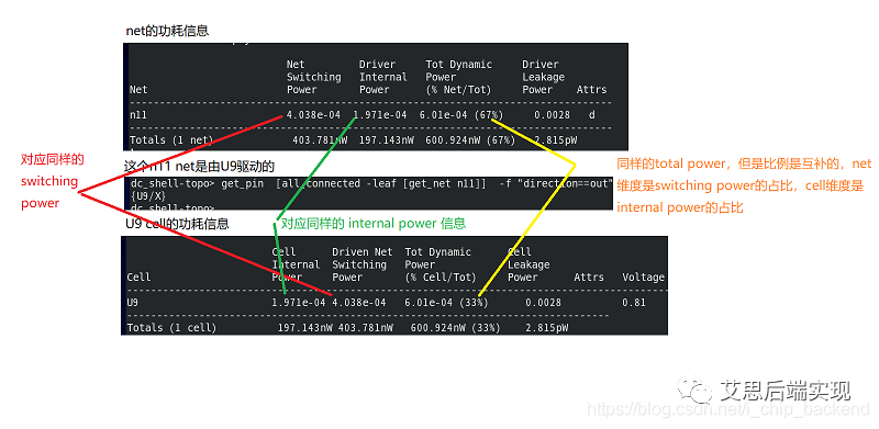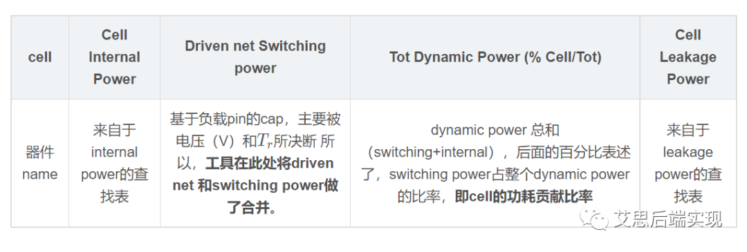 從上文描述中可以看到,net會描述switching power,cell對標(biāo)的則是internla power和leakage power。但是工具在產(chǎn)生報告的時候,無論是net還是cell都會把三類功耗打印完全,這里是使用output pin對應(yīng)的net來做的cell、net歸一化處理