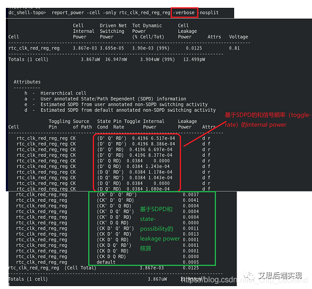 EDA工具提供了相應(yīng)的信息和抽取方式來擬合library的描述。以常用的DC工具里的report_power命令為例,工具會羅列出下面的功耗信息: