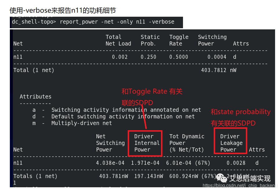 在report_power命令里邊,internal power被整合為cell類型,但是本質(zhì)上就是所有pin在SDPD下的總和表達(dá)。為了方便表達(dá),工具使用了上述三種對象對功耗進(jìn)行了分拆,總結(jié)如下