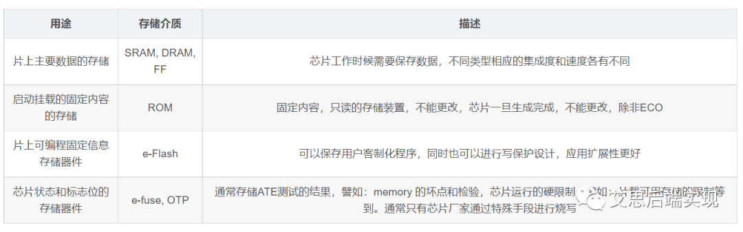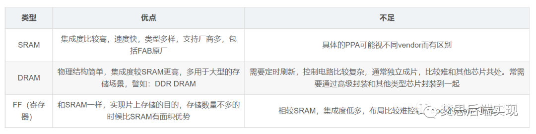 對于大型芯片而言,以上種種可能都會用到,但是最普遍,占比最大的還是第一類,這里使用下表對三種存儲方式各自的特點(diǎn)進(jìn)行一個拆解