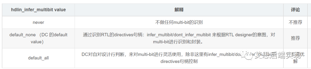 在讀入RTL之前,DC里邊通過(guò)配置 hdlin參數(shù):hdlin_infer_multibit 來(lái)對(duì)管理multi-bit的RTL階段的識(shí)別,