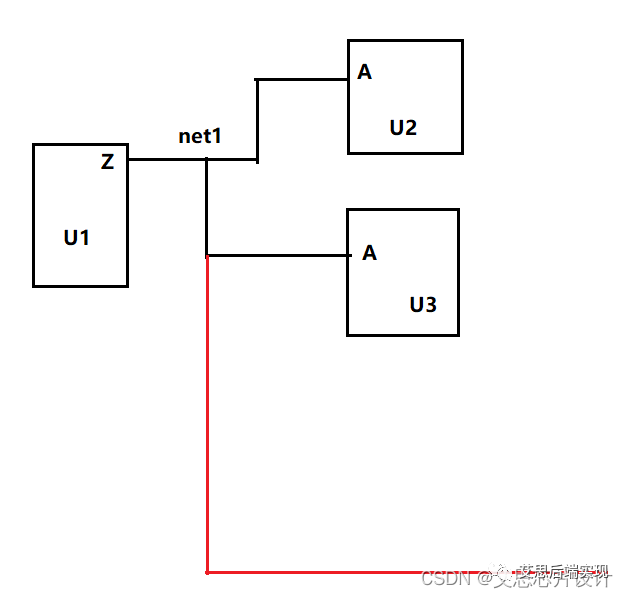 在上述拓?fù)浣Y(jié)構(gòu)結(jié)構(gòu)中,有兩個(gè)連結(jié)關(guān)系:U1.Z -> U2.A 和 U1.Z -> U3.A ,對應(yīng)的實(shí)際物理繞線如上述黑色和紅色走線標(biāo)記。這種繞線方式在INVS的verifyConnectivity評(píng)判里,就會(huì)將紅色部分的繞線(wire)報(bào)告一個(gè)DanglingWire的問題。紅色部分繞線已經(jīng)對這個(gè)繞線閉合結(jié)構(gòu)沒有任何貢獻(xiàn),同時(shí)還會(huì)導(dǎo)致net1的繞線被無意中變長,這樣的繞線會(huì)導(dǎo)致三個(gè)影響: