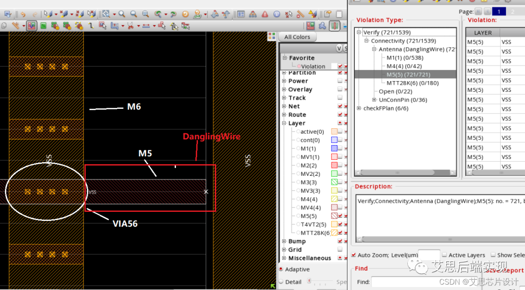 這里的PG連接是從M6 -> VIA56 -> M5,從INVS的理解來看,這條M5 wire的的最右側(cè)部分(從VIA56結(jié)束一直到M5的最右端,紅色高亮區(qū)域),是一小段的DanglingWire繞線,因?yàn)樵赩IA56的部分,這條M5已經(jīng)完成了PG貫通的使命,多出來的那部分就被INVS判定為沒有貢獻(xiàn)的DanglingWire。在PG創(chuàng)建的時(shí)候,無法在addStripe的命令從根本上解決,這是因?yàn)镻G stripe通常都是兩橫兩縱的布局,總會(huì)有一個(gè)VIA56 距離M5的端點(diǎn)較遠(yuǎn)。