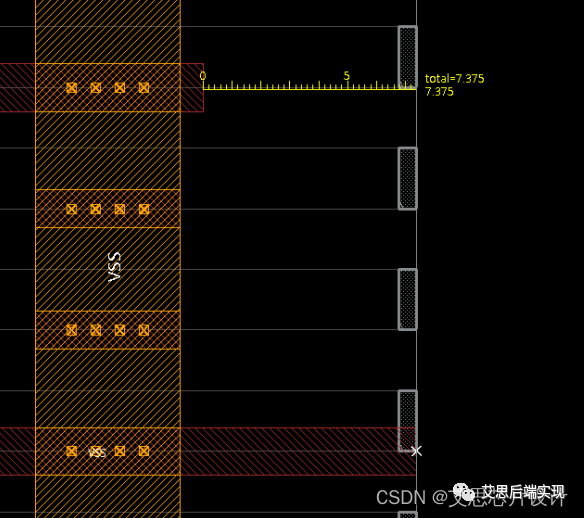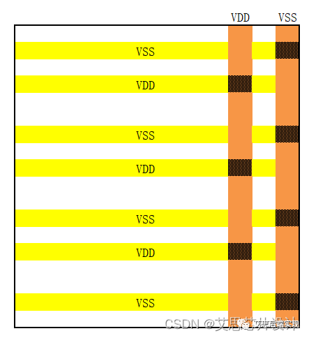 如上圖所示,盡管PG 布局里邊已經(jīng)將VSS的VIA56推到了最右側(cè),但是VDD的DanglingWire還是無法避免。由此可見,用戶在創(chuàng)建PG的時(shí)候。在使用同樣M6/M5的時(shí)候,通過調(diào)整offset,可以讓DanglingWire問題緩解,可以間接的提高IR的質(zhì)量,但是不能根治DanglingWire的問題