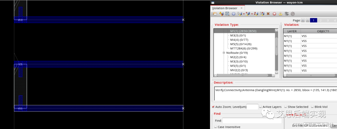 假設(shè)當(dāng)前設(shè)計(jì)的std-cell PG rail在M1層,INVS對M1的關(guān)注和M5是一致的,如果用戶沒有進(jìn)行任何的preplace std-cell的規(guī)劃,布局(包括tapcell,endcap等pre-place的器件),或者preplace std-cell的節(jié)點(diǎn)距離M1的終點(diǎn)有一些距離,那么在PG里邊也會(huì)報(bào)告類似的DanglingWire的問題。