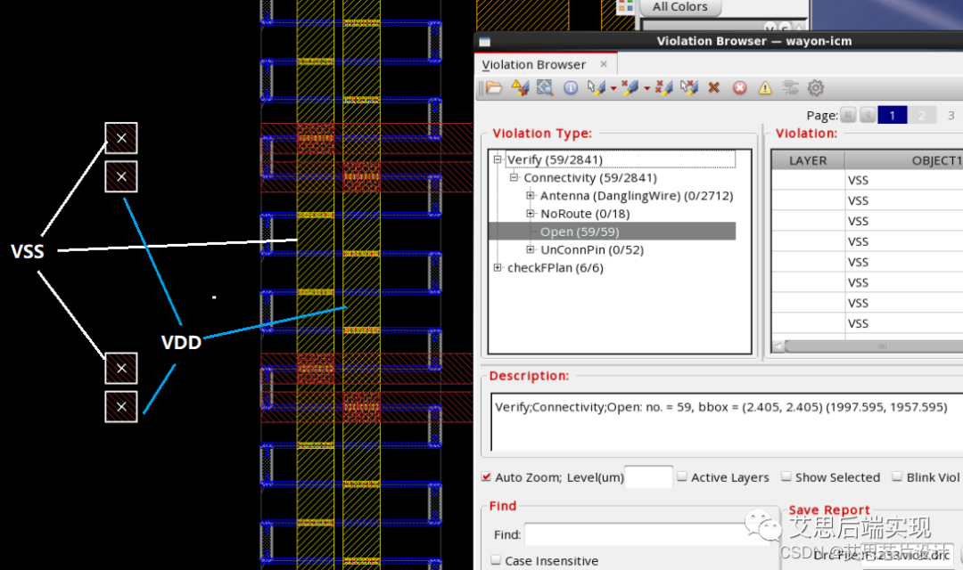經(jīng)過上述的討論,應(yīng)該已經(jīng)很好的理解INVS里邊對于DanglingWire的定義,對于普通用戶而言,DanglingWire的影響主要是侵占一些設(shè)計(jì)的繞線資源(但是要注意不同階段的DanglingWire由于負(fù)載的改變,這個(gè)違例的形態(tài)會(huì)發(fā)生一定的變化,譬如上述的std-cell rail 的DanglingWire問題)。相較而言,用戶更應(yīng)該優(yōu)先關(guān)注open問題,INVS 對open有兩種定義:
