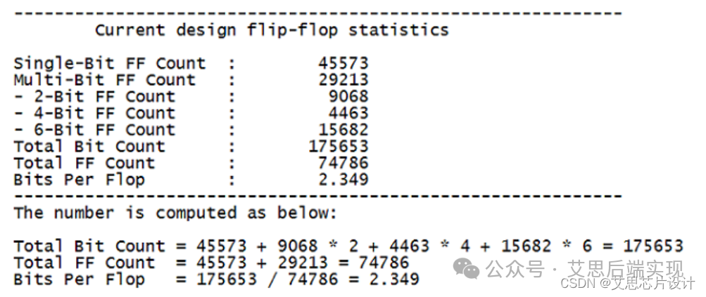 任何階段設(shè)置了setOptMode配置,任何階段使用place_opt_design | optDesign等命令,都會根據(jù)這個設(shè)定進行相應(yīng)的優(yōu)化,這個選項也會被完整地保存在invs的數(shù)據(jù)庫中。在invs的任何優(yōu)化后的數(shù)據(jù)庫中,可以使用命令reportMultiBitFFs -statistics 對MBFF的替換結(jié)果進行統(tǒng)計報告: