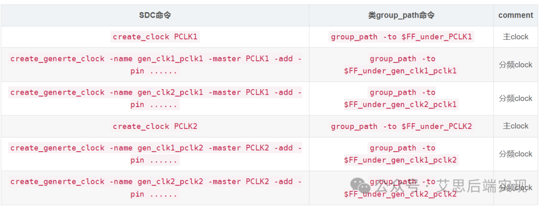 PS:雖然最新的DC也提供了基于違例(violation)和設(shè)計(jì)層次(hierarchy)的自動(dòng)路徑分組(path group)創(chuàng)建命令;create_auto_path_groups,但是這個(gè)命令只是一個(gè)補(bǔ)充性的,并沒有動(dòng)搖S家傳統(tǒng)的路徑分組方式。S家的這種分組方式對(duì)用戶是很友好的,基本就是將SDC的create_clock和create_generate_clock命令直接翻譯成了group_path 命令,映射關(guān)系見下表: