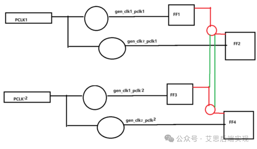 譬如這里的FF1,就會(huì)有兩個(gè)clock到達(dá):gen_clk1_pclk1和gen_clk2_pclk1,按照傳統(tǒng)S家的路徑分組理論,F(xiàn)F1會(huì)被分別歸入到gen_clk1_pclk1和gen_clk2_pclk1兩個(gè)分組,按照默認(rèn)方式,下面的path就有可能形成一個(gè)沖突(conflict)