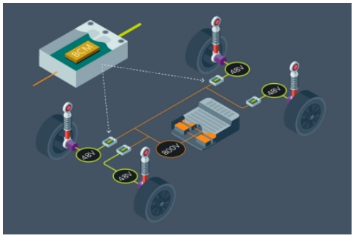 圖 1:Vicor 電源模塊整合 48V 架構(gòu)與高密度 DC-DC 轉(zhuǎn)換器(BCM6135),對設(shè)計市場上最小、最輕的主動懸架系統(tǒng)至關(guān)重要。該系統(tǒng)采用四個 Vicor 固定比率 BCM6135(800V-48V)DC-DC 母線轉(zhuǎn)換器,將高壓轉(zhuǎn)換為 48V 并向各個車輪供電。BCM6135 具備雙向供電功能,并提供所有 DC-DC 轉(zhuǎn)換器中最快的瞬態(tài)響應(yīng)速度。這種對稱的開關(guān)速度在電機(jī)直接連接 DC-DC 轉(zhuǎn)換器時可實現(xiàn)最佳的能量回收。