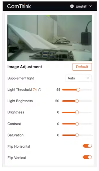 如果使用OV5640攝像頭模組,可根據(jù)實際場景需要調(diào)整設(shè)備的圖像設(shè)置。所有內(nèi)容都是可配置的,USB相機模塊只支持可調(diào)的補光設(shè)置,USB相機模塊只支持補光設(shè)置