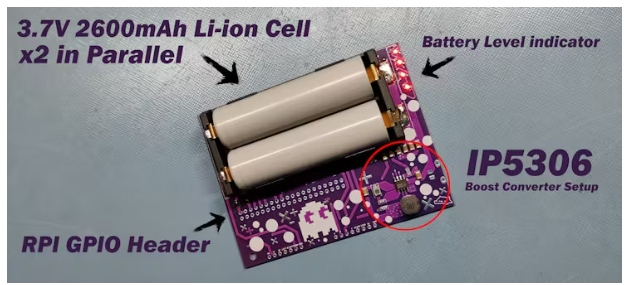 配電板包含IP5306 IC,這是一種鋰離子電源管理IC,通常用于商業(yè)移動(dòng)電源。
