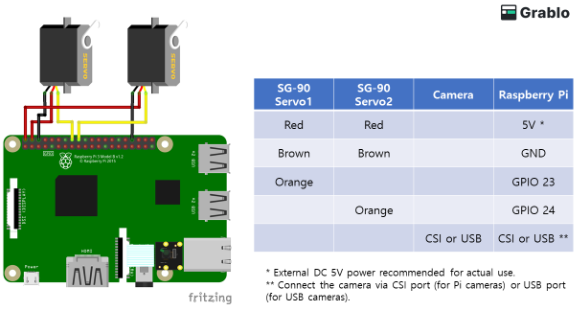 ?電源:在使用Pi的5V進行測試時,請使用外部5V直流電源(最小2A),以確保雙伺服系統(tǒng)穩(wěn)定運行