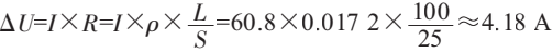 式中:ΔU為壓降;R為導(dǎo)線電阻;P為銅電阻率,P=0.0172Ω.mm2;L為電纜長度;S為導(dǎo)體截面積,S=25mm2。