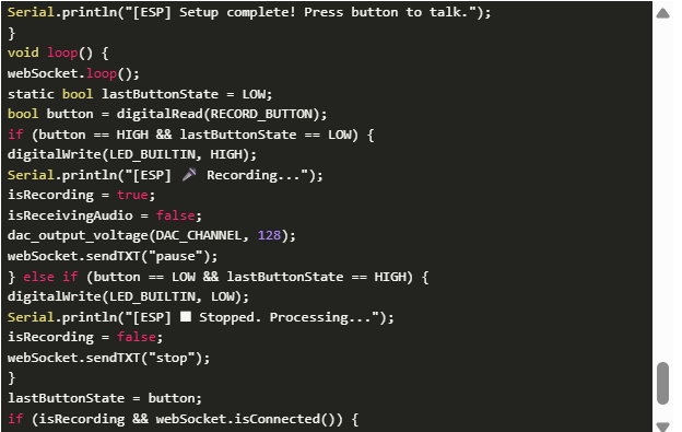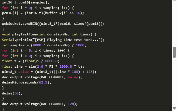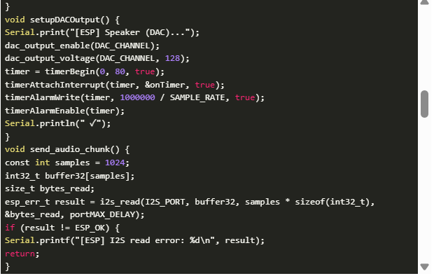 響應(yīng)回放,服務(wù)器將8位PCM塊流回ESP32用于DAC輸出。用戶聽到AI語音,LM386放大器驅(qū)動(dòng)揚(yáng)聲器。