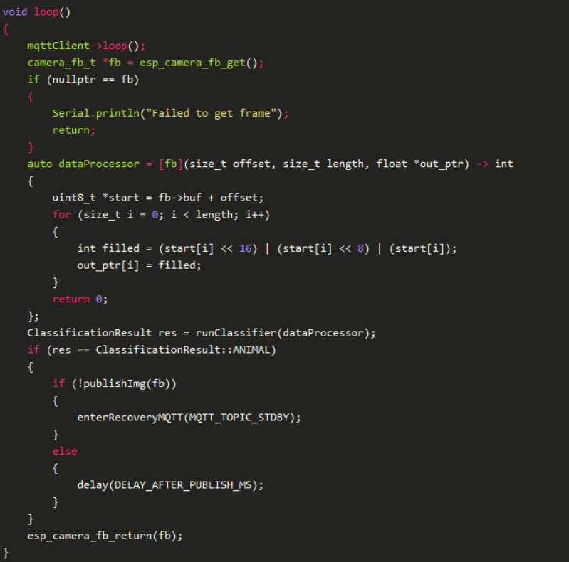 在實(shí)際硬件上,一旦檢測(cè)到,ESP32-CAM使用MQTT通知主處理單元,并通過(guò)它發(fā)送整個(gè)幀以進(jìn)行進(jìn)一步處理。這個(gè)設(shè)備的主循環(huán)非常簡(jiǎn)單: