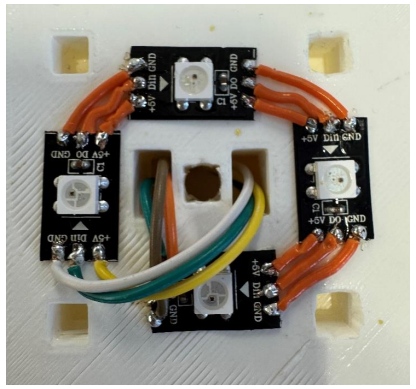 按照參考圖片(我們用藍(lán)色標(biāo)記led)。焊接5V到5V, GND到GND, DOUT到DIN使用跳線切割到正確的長度。之后,剝線結(jié)束,并將其焊接到LED。