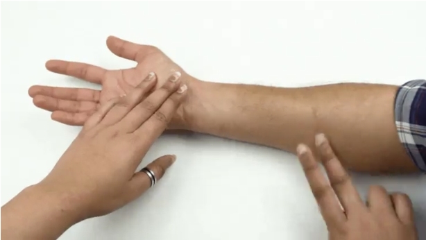 ?將IN+和IN-電纜放在手臂的指伸肌上,REF(參考)放在肘關(guān)節(jié)的骨部。