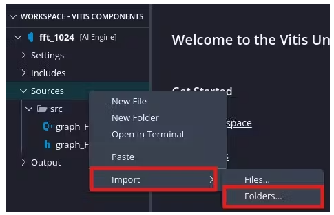 要導(dǎo)入文件,右鍵單擊fft_1024 AI引擎組件下的Sources,然后單擊import > Folders…