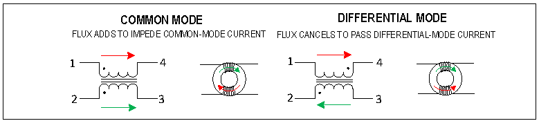 差模配置會阻礙差模信號通過,但允許共模信號通過。對于差模信號,磁通沿相反方向通過電感,相互抵消,因此允許差分信號通過扼流圈。