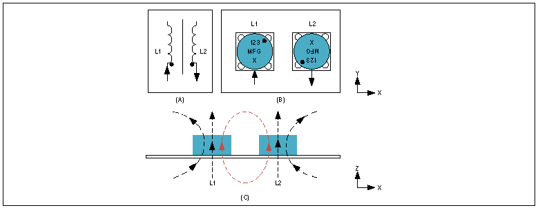 圖8.兩個獨立電感的組合及其配置圖示:(A)差模連接,(B)PCB上,(C)差模信號通過時的磁場