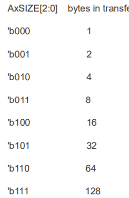 突發(fā)尺寸為每次傳輸?shù)腷yte數(shù)量,與突發(fā)傳輸?shù)牡刂奉A(yù)測相關(guān)性很強(qiáng)。每次的突發(fā)尺寸不能超過數(shù)據(jù)通道的寬度;若突發(fā)尺寸小于數(shù)據(jù)通道寬度,需要指定哪些位數(shù)是有效的。突發(fā)尺寸為2^AxSIZE[2:0]