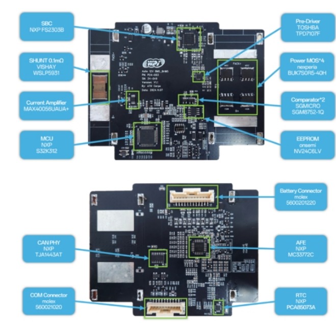 在采用NXP多款高性能芯片的同時,方案還選用了Molex 5600201020連接器、onsemi NV24C64LV EEPROM、Vishay WSLP5931大功率電阻器、安世半導體BUK7S0R5-40H MOSFET以及圣邦微電子SGM8752-1Q比較器等高品質(zhì)周邊器件,它們協(xié)同工作,共同構成了完整的解決方案。