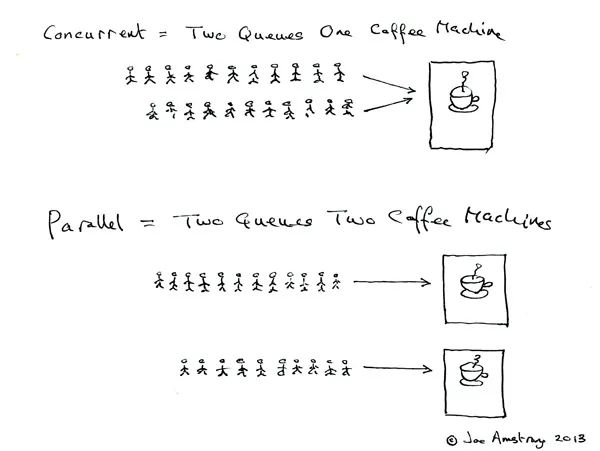 這里隊列中的每個人類比于計算機的任務(wù),咖啡機類比于計算機處理器。因此:并發(fā)和并行都是在多任務(wù)的環(huán)境下的討論。