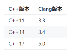 - C++標準與相應(yīng)的Clang版本要求如下: