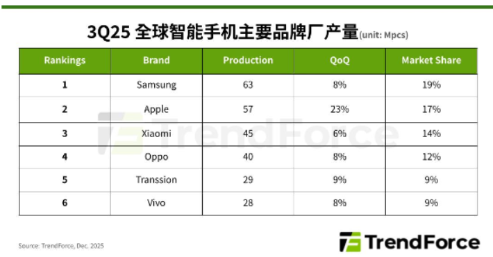 Apple(蘋果)第三季手機產(chǎn)量約為5,700萬支,創(chuàng)歷年第三季最高,居第二名。其iPhone 17基本款“價格持平、容量升級”的策略成功,Pro系列外觀辨識度升級亦有助拉貨。Xiaomi[小米,含Redmi(紅米)、POCO]下半年借新機發(fā)布、節(jié)慶備貨激勵出貨動能,第三季產(chǎn)量近4,500萬支,季增約6%,位居第三。