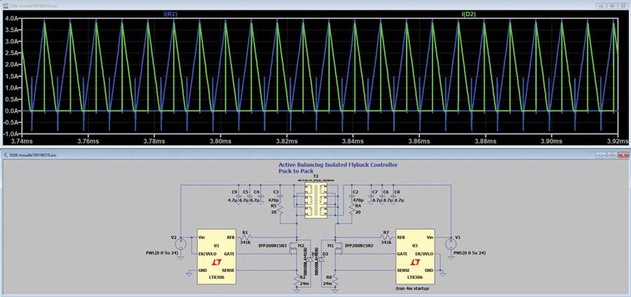 圖4顯示了采用ADP1612升壓轉(zhuǎn)換器和LT8309同步整流以實(shí)現(xiàn)主動(dòng)均衡的反激電源級(jí)的完整LTspice仿真。