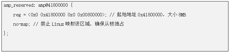 為避免 Linux 內(nèi)核占用從核的運行內(nèi)存,需在 reserved-memory 節(jié)點中劃分專屬內(nèi)存區(qū)域。例如,為 RT-Thread 從核預(yù)留 8MB 內(nèi)存: