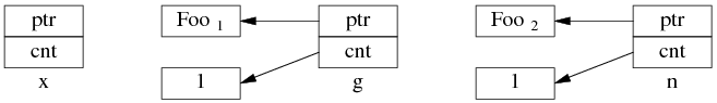 shared_ptrsp2 = sp1; // 這時 sp1.ptr 和 sp2.ptr 可能指向不同的地址,因為 Bar subobject 在 Foo object 中的 offset 可能不為0。