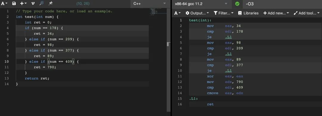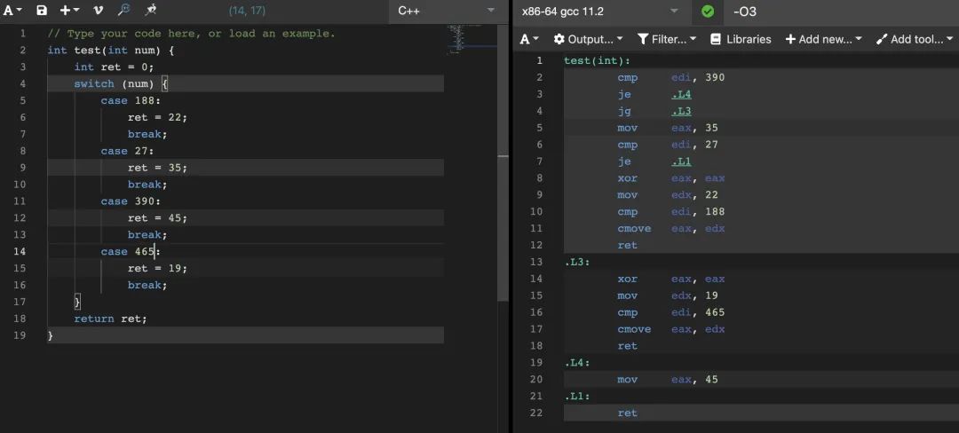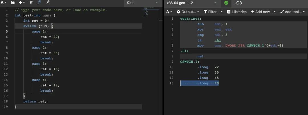 首先看下switch-case,即下面這張圖,左半部分是C代碼,右半部分是對應的匯編代碼,編譯選項是O3,即我們在實際項目中經(jīng)常使用的優(yōu)化選項。