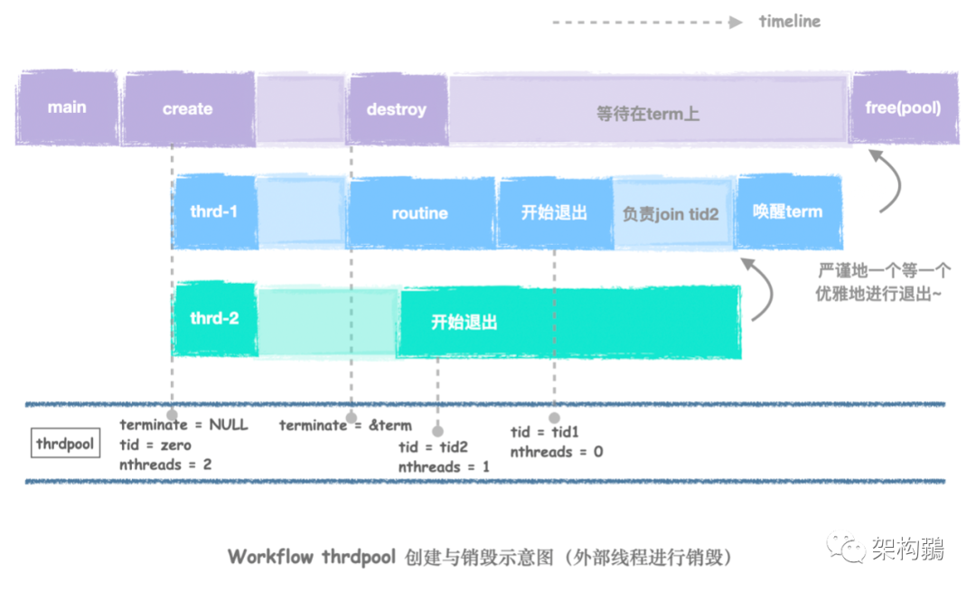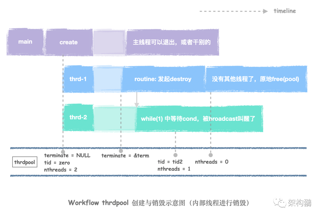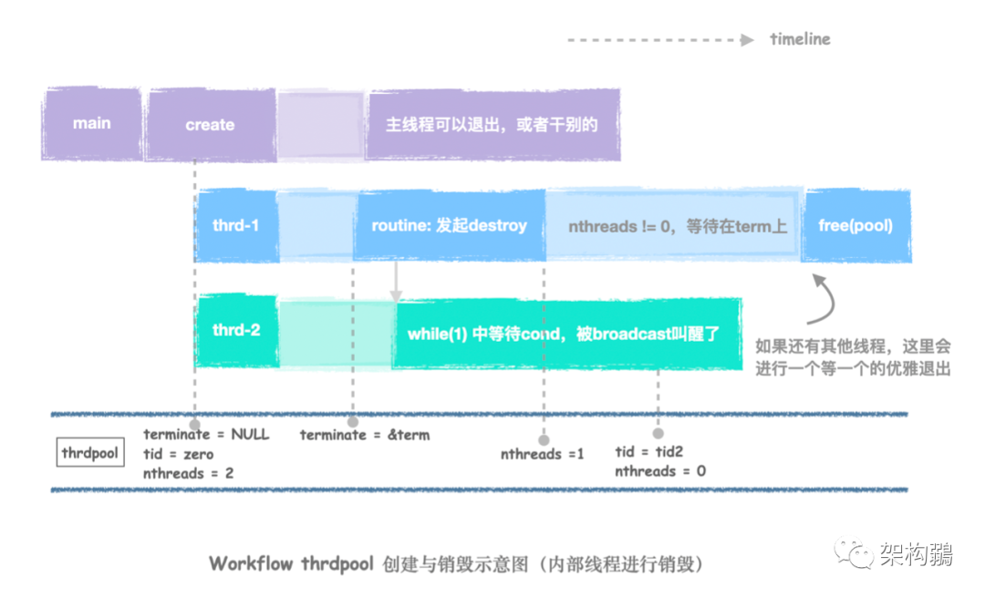 - 一個(gè)pthread_cond_t *terminate,這有兩個(gè)用途:不僅是退出時(shí)的標(biāo)記位 ,而且還是調(diào)用退出的那個(gè)人要等待的condition。