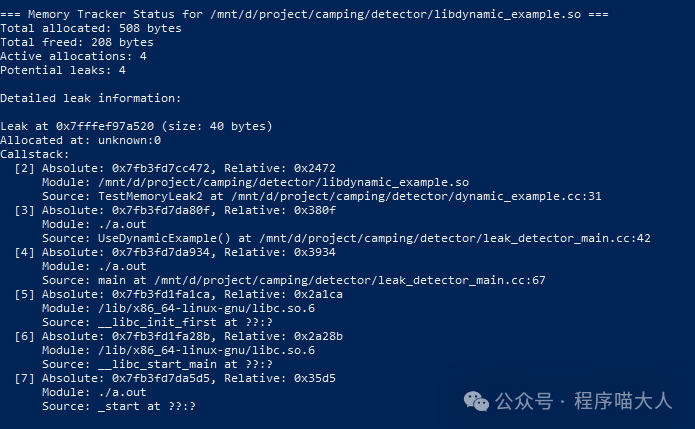 int main() { OpenDynamicExample(); MemoryDetector detect("/mnt/d/project/camping/detector/libdynamic_example.so"); detect.StartTracking(); UseDynamicExample(); detect.StopTracking(); // 會打印 lib1.so 的內存使用情況 CloseDynamicExample(); return 0; }