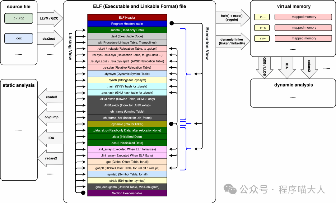 本項目使用的 PLT HOOK 并不是修改磁盤上的 ELF 文件,而是在運(yùn)行時修改內(nèi)存中的數(shù)據(jù),因此我們主要關(guān)心的是執(zhí)行視圖,即 ELF 被加載到內(nèi)存后,ELF 中的數(shù)據(jù)是如何組織和存放的。