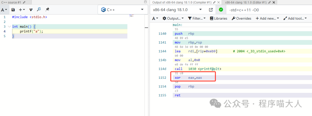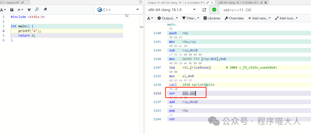 xor eax, eax,表示使用異或操作將eax寄存器的值清零。在x86-64架構(gòu)中,main函數(shù)的返回值通常通過eax寄存器傳遞。因此,這行代碼表示main函數(shù)返回0。