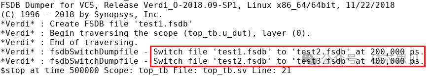 $fsdbSwitchDumpfile(“NewFileName”|NewFileName_var[,”+fsdbfile+pre_file”|,pre_file_var]);這里需要注意,如果指定”+fsdbfile+pre_file”,那么波形記錄將從此刻開始記錄新的波形到文件NewFileName中,原來的pre_file波形文件關(guān)閉;如果沒有指定”+fsdbfile+pre_file”,那么波形記錄將從當(dāng)前激活的正在記錄的波形文件切換至新的波形文件NewFileName中,而之前記錄波形的文件將關(guān)閉。