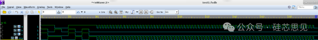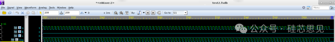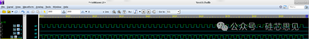 ?從仿真結(jié)果來看,仿真波形的記錄從test1.fsdb切換到test2.fsdb,然后從test2.fsdb切換到test3.fsdb。當(dāng)200ns仿真波形從test1.fsdb切換到test2.fsdb時(shí),test1.fsdb波形保存關(guān)閉,此時(shí)可以通過Verdi打開觀測(cè)到已經(jīng)dump的波形,并且此時(shí)同時(shí)開始記錄仿真波形到test2.fsdb中,當(dāng)400ns仿真波形從test2.fsdb切換到test3.fsdb時(shí),test2.fsdb波形保存關(guān)閉,也可以通過Verdi打開觀測(cè)到已經(jīng)dump的波形,同時(shí)開始記錄仿真波形到test3.fsdb中,直到仿真結(jié)束。
