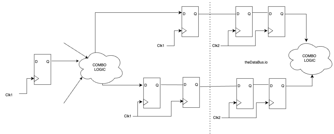 這里的問(wèn)題是,這兩個(gè)信號(hào)通過(guò)同步器可能需要不同的時(shí)間,因此當(dāng)它們到達(dá)它們相互作用的邏輯時(shí),可能不會(huì)真正“同步”。