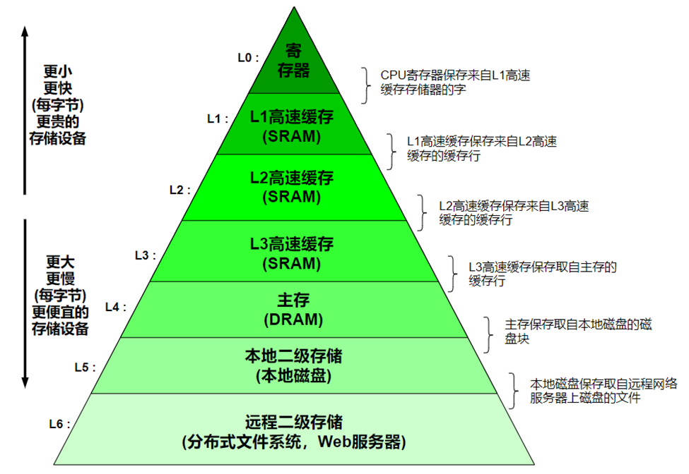 訪問memory數(shù)據(jù)的速度與core的運(yùn)行速度相比,要花費(fèi)更多的時鐘周期。為了減少這個差異計算機(jī)系統(tǒng)引進(jìn)了存儲器層次結(jié)構(gòu),如圖1所示。在層次結(jié)構(gòu)中,越往上,讀寫速度越快,價格越貴,存儲容量也越小。